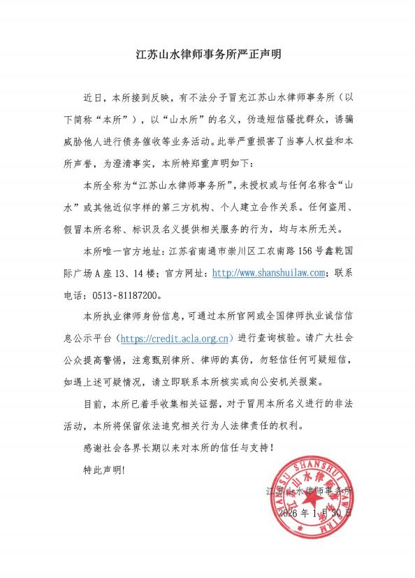![]() 近日,本所接到反映,有不法分子冒充江苏山水律师事务所(以下简称“本所”),以“山水所”的名义,伪造短信骚扰群众,诱骗威胁他人进行债务催收等业务活动。此举严重损害了当事人权益和本所声誉,为澄清事实,本所特郑重声明如下: 本所全称为“江苏山水律师事务所”,未授权或与任何名称含“山水”或其他近似字样的第三方机构、个人建立合作关系。任何盗用、假冒本所名称、标识及名义提供相关服务的行为,均与本所无关。 本所唯一官方地址:江苏省南通市崇川区工农南路156号鑫乾国际广场A座13、14楼;官方网址:http://www.shanshuilaw.com;联系电话:0513-81187200。 本所执业律师身份信息,可通过本所官网或全国律师执业诚信信息公示平台(https://credit.acla.org.cn)进行查询核验。请广大社会公众提高警惕,注意甄别律所、律师的真伪,勿轻信任何可疑短信,如遇上述可疑情况,请立即联系本所核实或向公安机关报案。 目前,本所已着手收集相关证据,对于冒用本所名义进行的非法活动,本所将保留依法追究相关行为人法律责任的权利。 感谢社会各界长期以来对本所的信任与支持! 特此声明! 江苏山水律师事务所 2026年1月30日 |